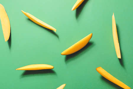 Tropical fruit, Mango slices on yellow background. Top view