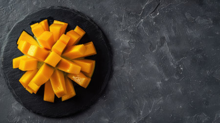 chopped mango on black slate plate on wooden table, copy space