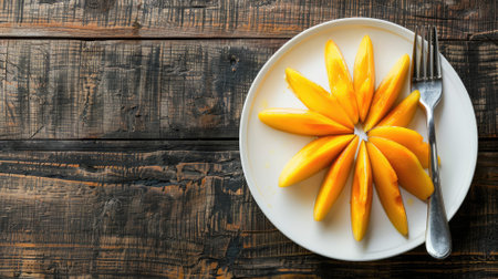 Sliced mango arranged on white plate with fork rustic wooden table