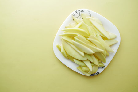 green mango sliced on a white plate thai fruit summer, Top view