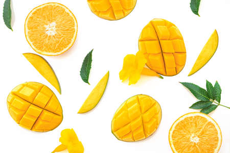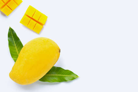 Fresh yellow Mango on white background. Tropical summer concept. Top view, close up, macro, copy space.