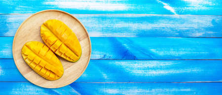 Tropical fruit, Mango in wooden plate on blue wooden background.