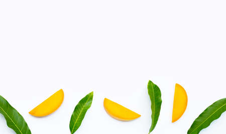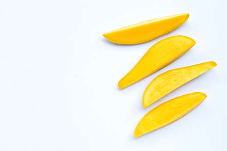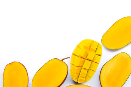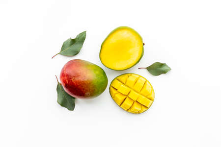 Fresh yellow Mango on white background. Tropical summer concept. Top view, close up, macro, copy space.