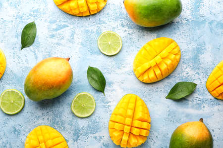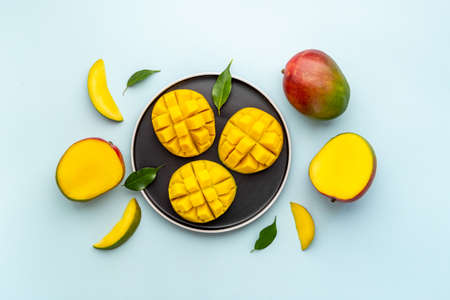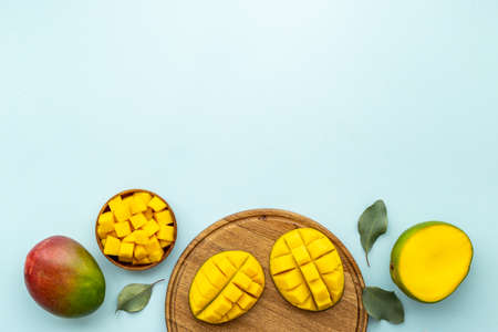 Mango background design concept. Top view of diced fresh mango fruit pattern with leaves on blue table.