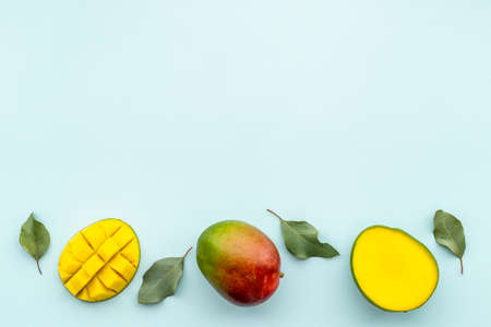 Ripe mangoes with green leaves on light blue background, tropical fruit concept
