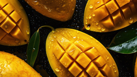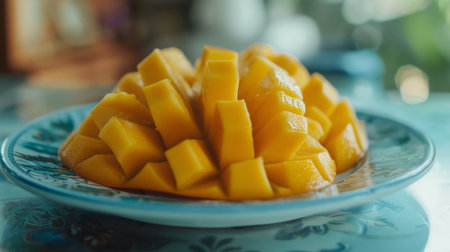 Sweet mango cubes are perfectly cut and gleaming with moisture, showcasing summers bounty.