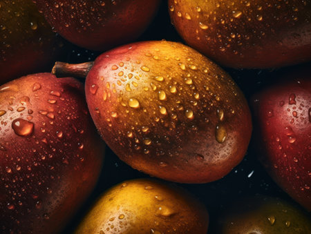 Ripe mangoes on a tree with water droplets representing natural beauty and freshness in tropical paradise