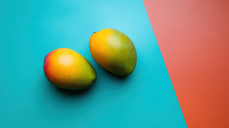 Two fresh mangoes sit beautifully against a bright, colorful backdrop, showcasing their natural vibrancy and health benefits for food enthusiasts.