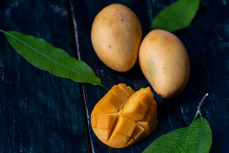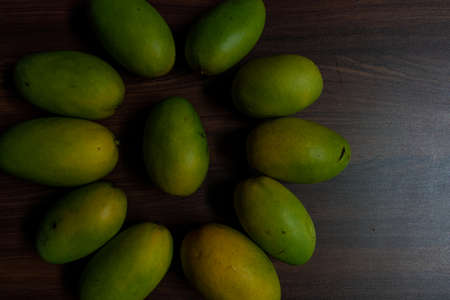 Group of ripe mangoes in dark environment on wooden table. Top view.