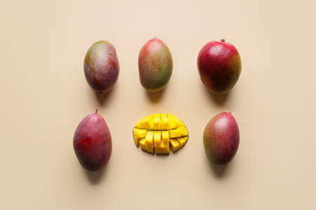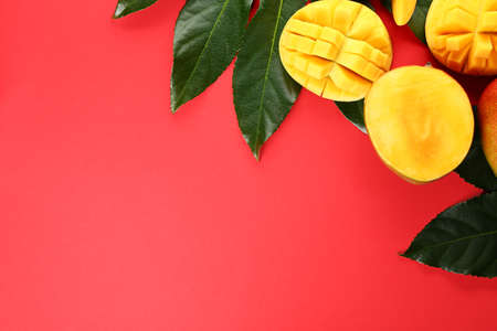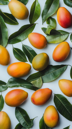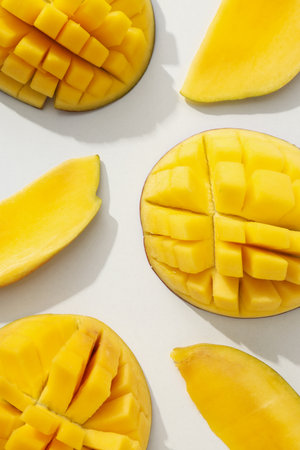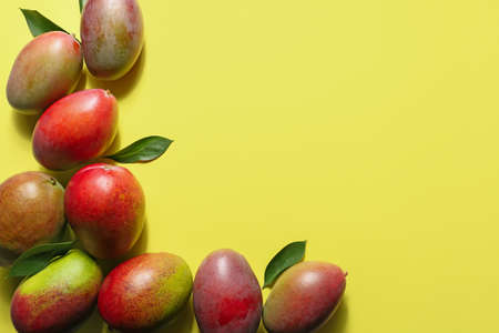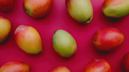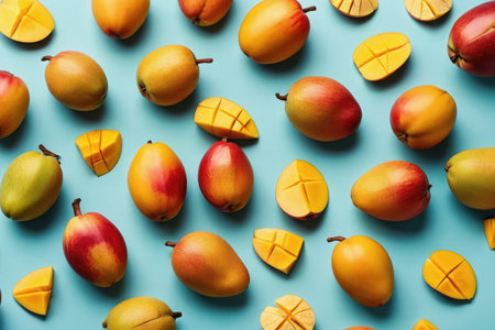 Top view of juicy mangoes scattered on a bright colored background, perfect for adding text or design elements, with a fresh, tropical appeal