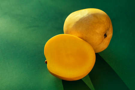 Sweet juicy ripe yellow mangoes on a green background under harsh shadow
