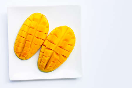 Tropical fruit, Mango on dish plate on white background. Copy space