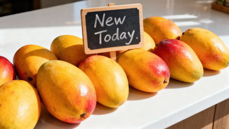 Eleven reddish-yellow ripe mangoes arranged on a glossy white counter, dramatically illuminated by natural sunlight, featuring a small wooden stand-up chalkboard message.
