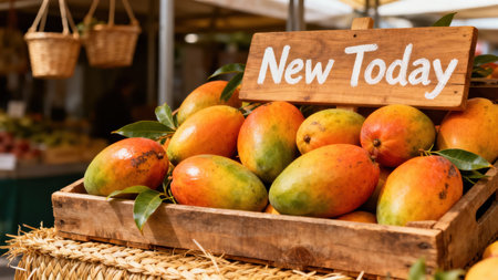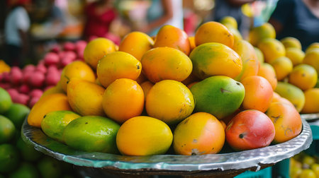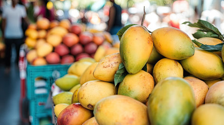 A close-up view of ripe mangoes displayed at a lively market stall, capturing the vibrant colors and fresh appeal of tropical produce. Perfect for food enthusiasts.