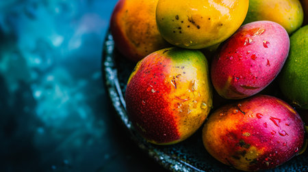 Colorful overhead shot of fresh mangoes with water droplets for food and summer design