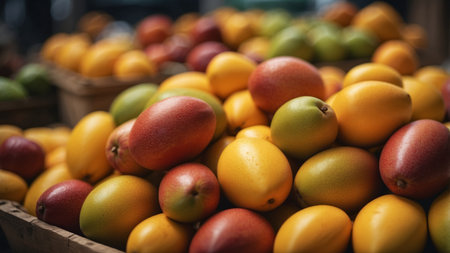 AI Generated. Closeup of colorful pile of mangoes in tropical fruit market for healthy eating and nutrition concept