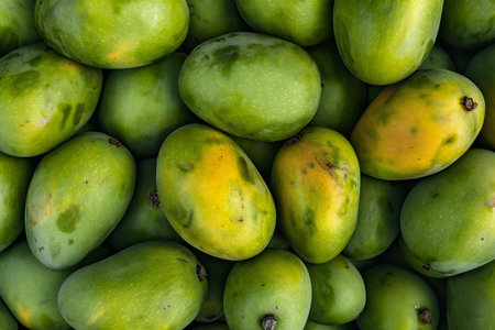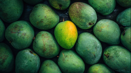 This stunning image showcases fresh green mangoes with one vibrant yellow mango at the center, symbolizing freshness and healthy eating. Ideal for food-themed projects.