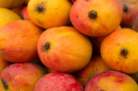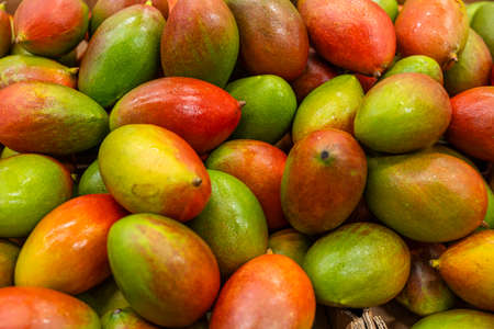 Close up view of colorfull ripe mango fruits on a shelf of supermarket.