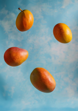 Flat lay of ripe mangoes on a vibrant background with open copy space for design, offering a tropical, juicy aesthetic for food concepts