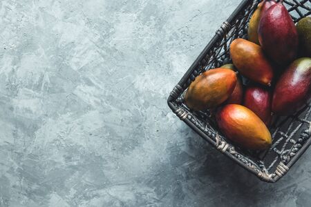 large mangoes in a wicker basket on a gray background. Healthy food, vegan