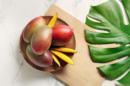 Fresh mango fruit with sliced diced mango chunks on a plate or on leaves as a background