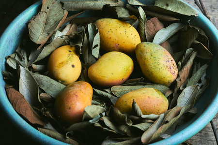 A top view closeup of ripe mangoes inside of a blue bowl with leaves on the ground