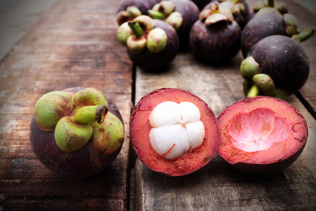 Fresh Mangosteen fruit on wood texture Thai fruit.