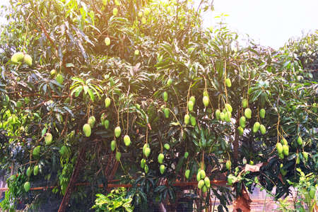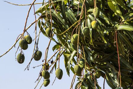 Green mangoes on the tree. Mango trees growing in a field in Asia. Mangoes fruit plantation. Delicious fruits are rich in vitamins