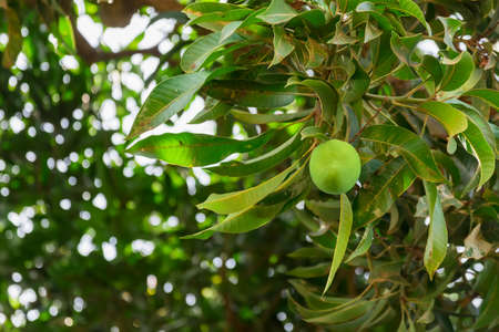 Green mango fruit on tree with tropical farm background in Thailand. Agriculture industry concept at harvest in summer.