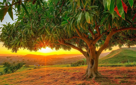 The Mango at sunset, Golden red sunset light filters through the leaves, still atmosphere, warm orange glow blending with natural green tones.