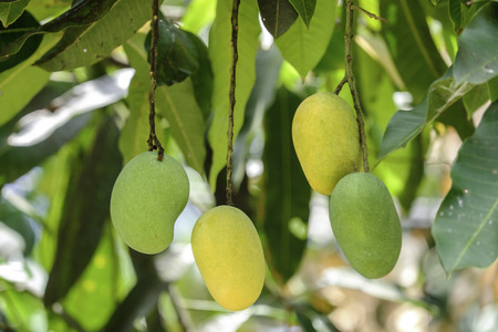 Mango fruit on the tree with sunlight in the morning. Selective focus.