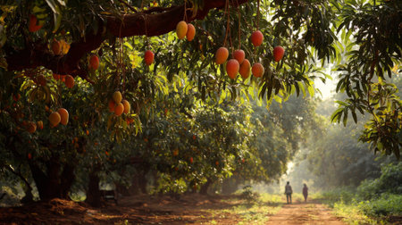 A picturesque mango orchard with ripe mangoes hanging from branches, creating a serene atmosphere as people stroll along the sunlit pathway.