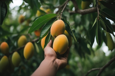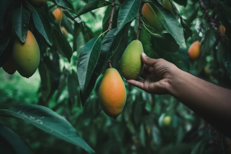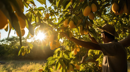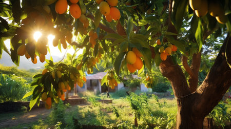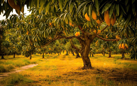 Lush tropical mango plantation features trees heavy with ripe golden mangoes, vibrant green leaves illuminated by soft natural light.