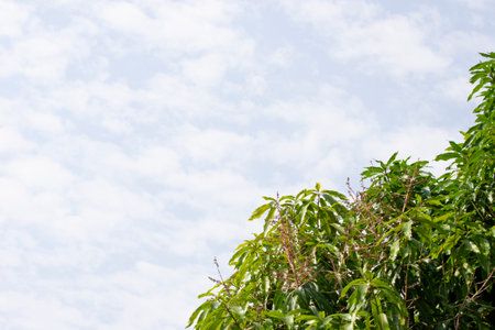 Mango tree branch with unripe mangoes, tropical garden under cloudy sky, generative ai