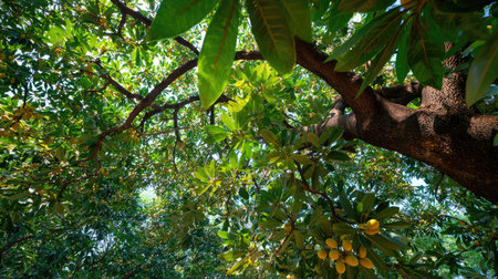 The Jackfruit tree in summer, Bright sunlight pierces dense foliage, the air feels hot, natural color