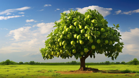 In this awe-inspiring image, a tree stands adorned with a multitude of green mangoes, showcasing a bountiful harvest. The branches sag under the weight of the luscious fruits, creating a breathtaking sight of abundance and growth. The vibrant green hues of the mangoes against the backdrop of the tree's lush foliage evoke a sense of freshness, vibrancy, and promise, a testament to the natural cycle of life, the rich rewards of nature's nurturing, and the joys of tropical fruit farming.