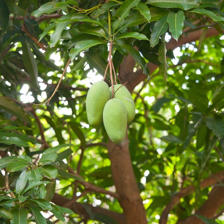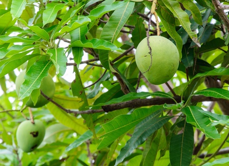 green mangoes on tree, Green mangoes growing on a tree. Healthy mango green fruit.