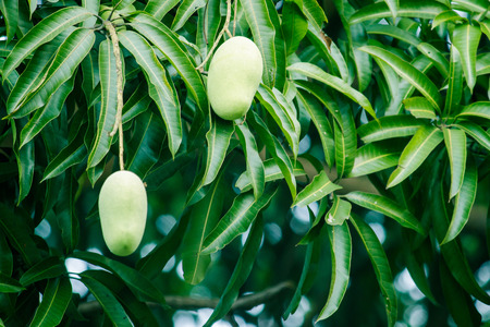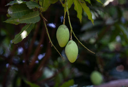 Close up of growing Mangos Hanging on Mango Tree, Mangifera indica. Fresh Fruits on the tree.