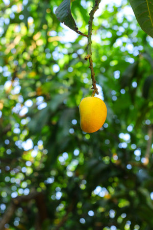 Fresh mango fruit Mangifera indica hangs from a tree in tropical Naples, Florida
