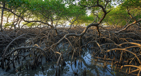 Root of mangrove tree forest in sunlight.