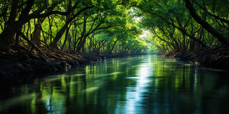 Serene coastal waterway flows through dense mangrove forest, with sunlight filtering through lush green canopy, creating tranquil and picturesque scene