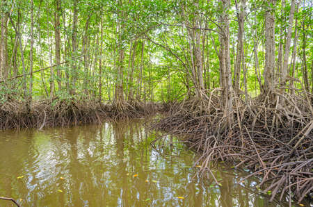 Mangrove trees in forest at the estuary of a river. Mangrove forest and river landscape at Khao Khanap Nam, Krabi, Thailand. Beautiful root in mangrove forest.