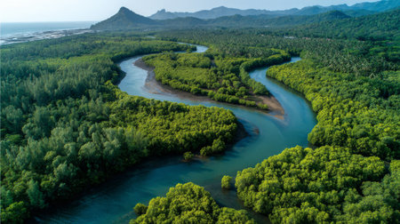 Illustration of bird's-eye view of the mangrove forest, winding river and sea water in green colors. the whole scene is filled with natural beauty. it presents high definition photography. green trees cover the entire landscape, and curved rivers flow through it like ribbons. shot from different an