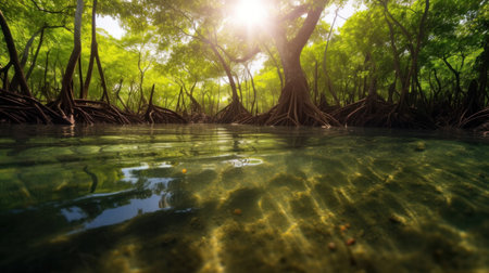 Immerse yourself in a tranquil mangrove forest scene, showcasing lush greenery, winding roots, and clear water, embodying the rich beauty of nature and biodiversity.