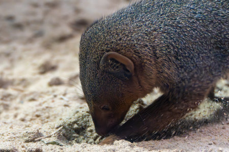 A dwarf mongoose digs intensively in the sand with its snout and paws. Grains of sand fly through the air.