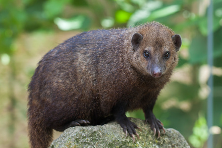 A portrait of a small terrestrial carnivorous mammal called mongoose on a rock