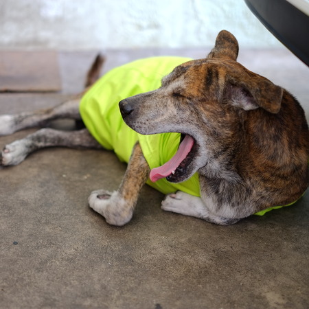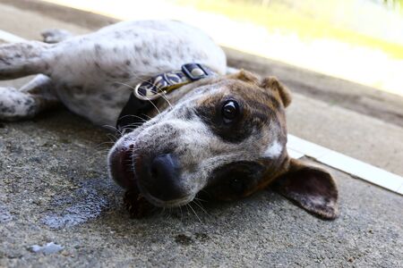 A stray dog lies on the street. An abandoned animal is waiting for its owner. Dog unattended.