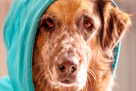 Dog looks at his master from work near the house. Dog is a faithful and best friend of man