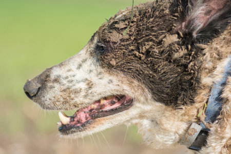 a mongrel dog with sad eyes looks up at a person. Perhaps sad from loneliness or bored