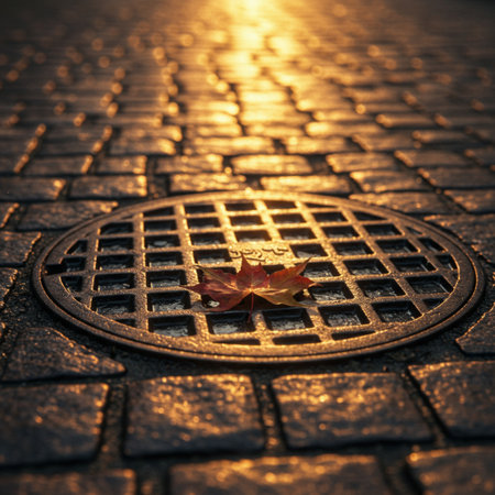 Autumn leaf on a manhole cover on a cobblestone street